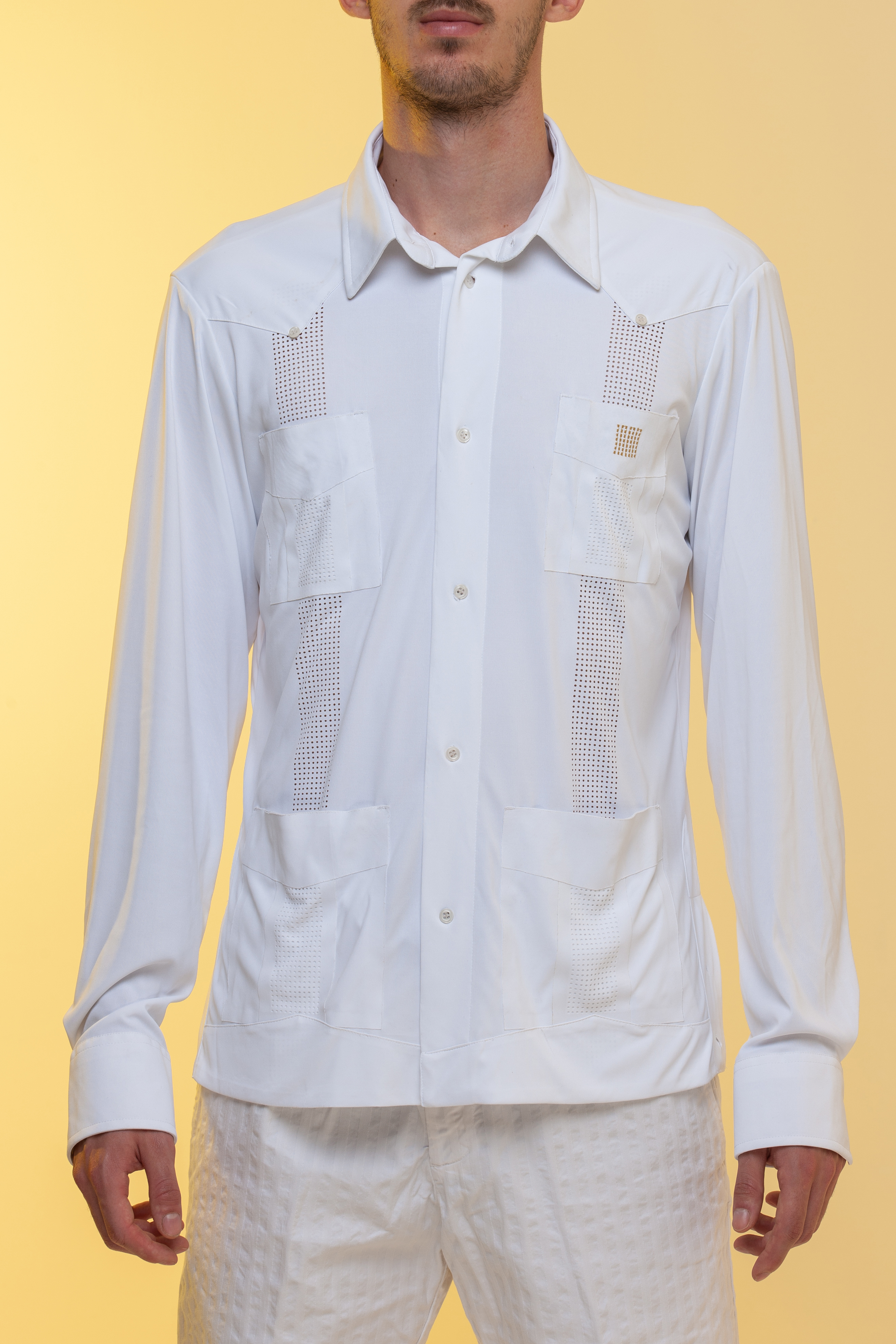 L'esclusività di questa guayabera è evidente nei preziosi dettagli, l'assenza di cuciture in alcune parti,