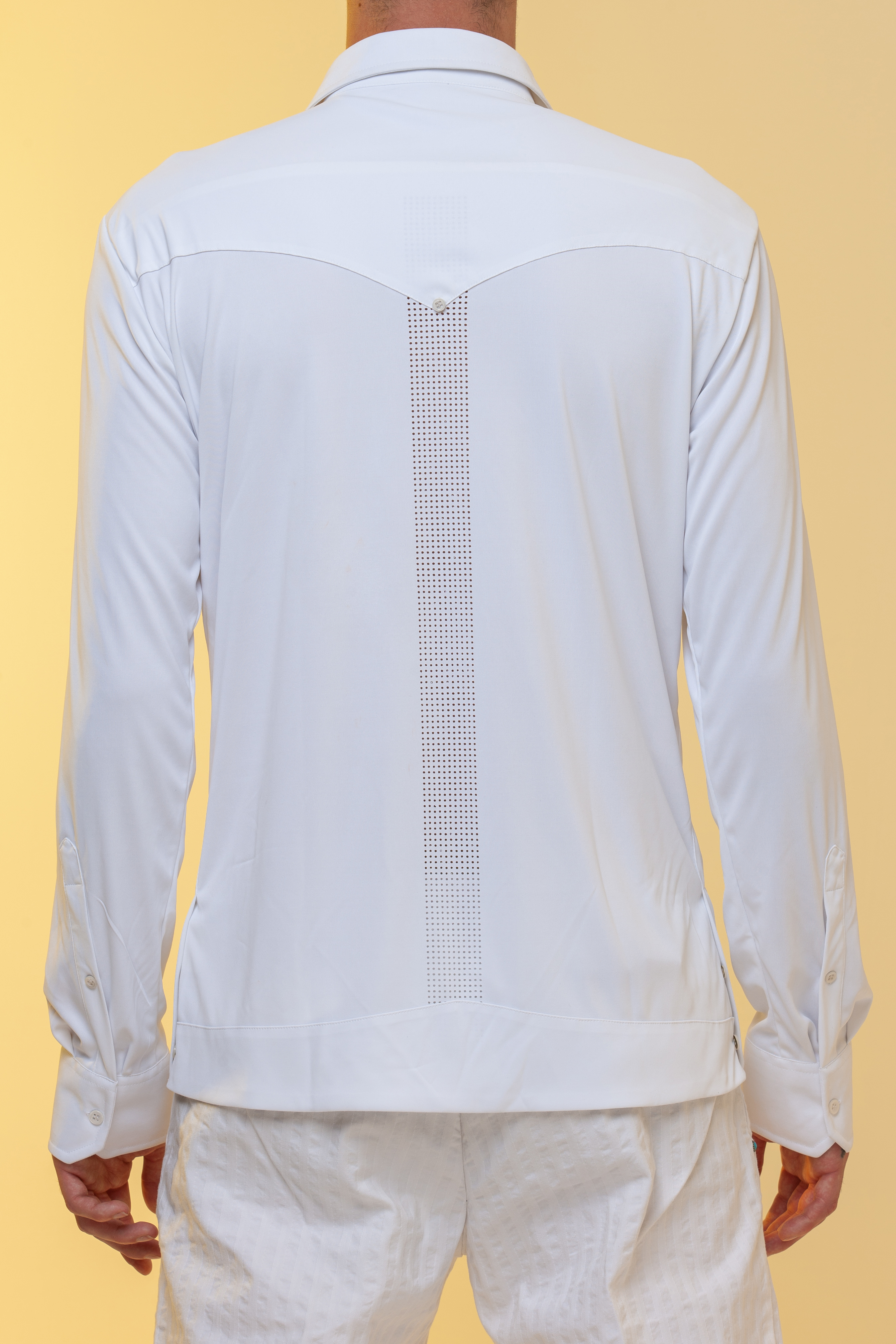 dettagliate con micro fori identici e allineati a quelle del corpo della camicia. La parte superiore di ogni tasca