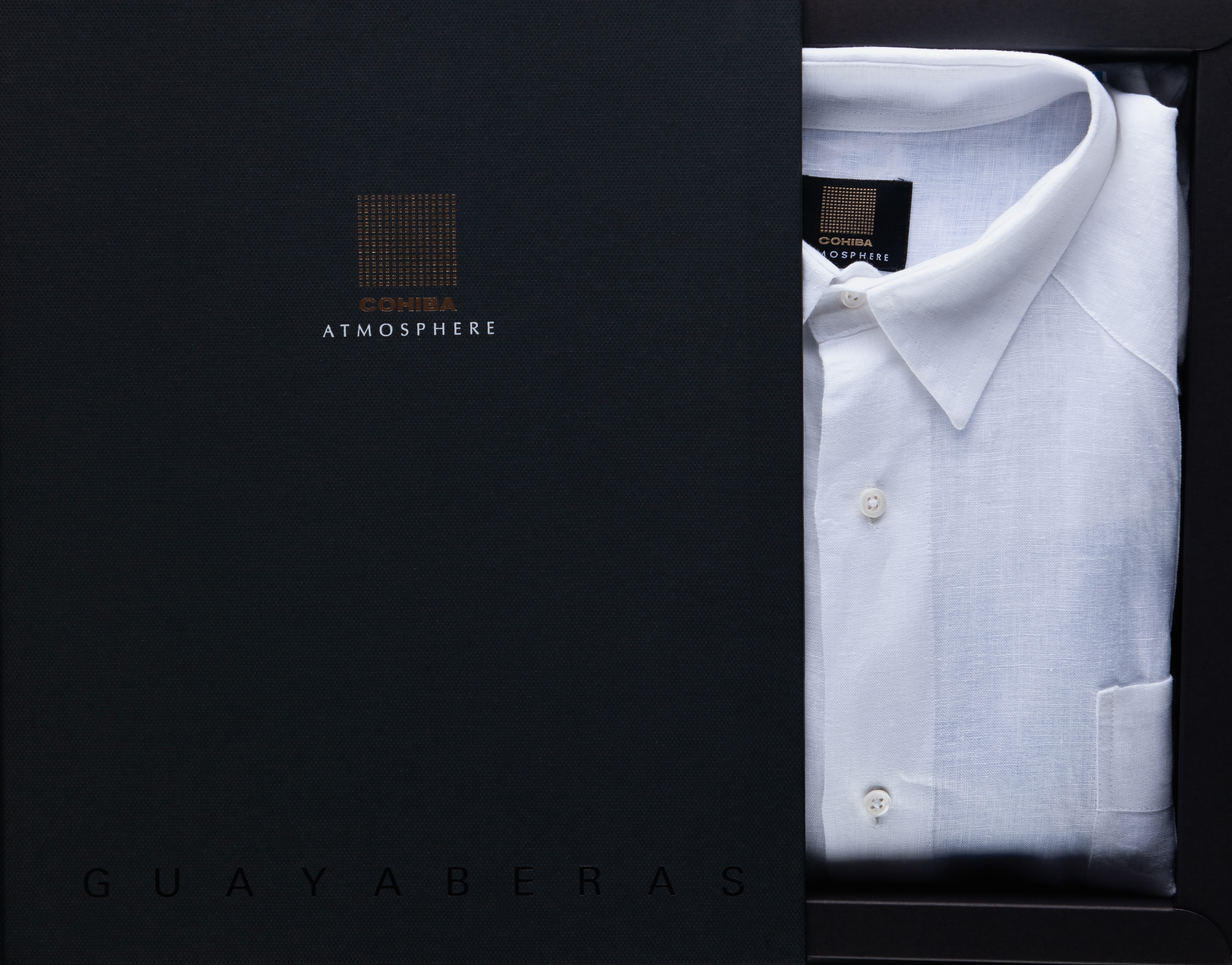 La guayabera include aperture su entrambi i lati, chiuse da tre bottoni e il logo Golden Cohiba Atmosphere